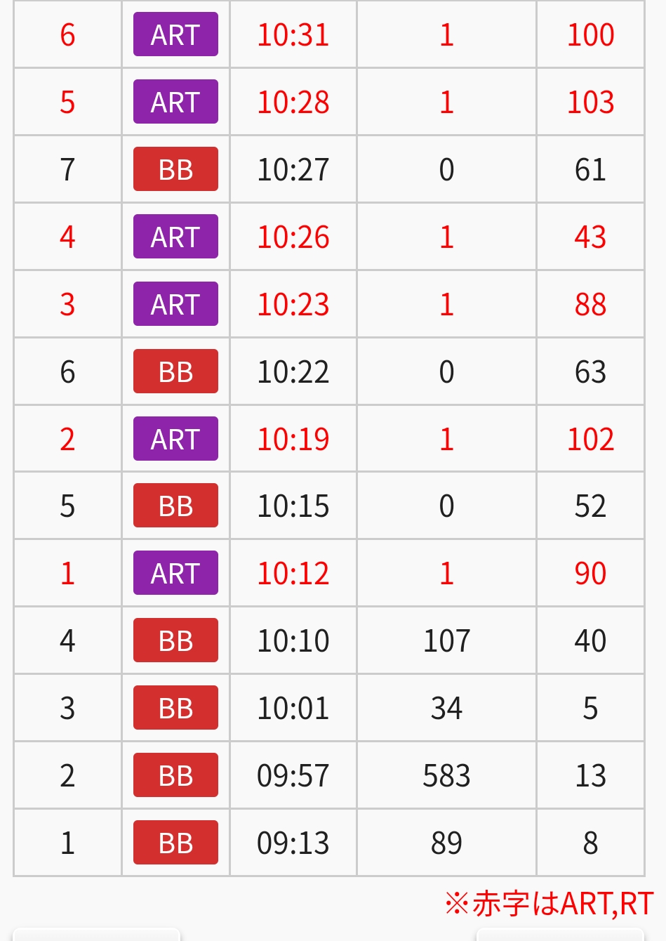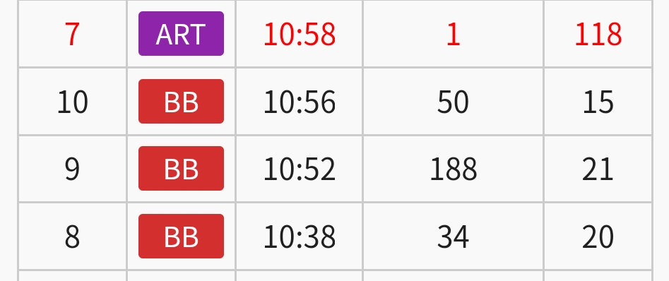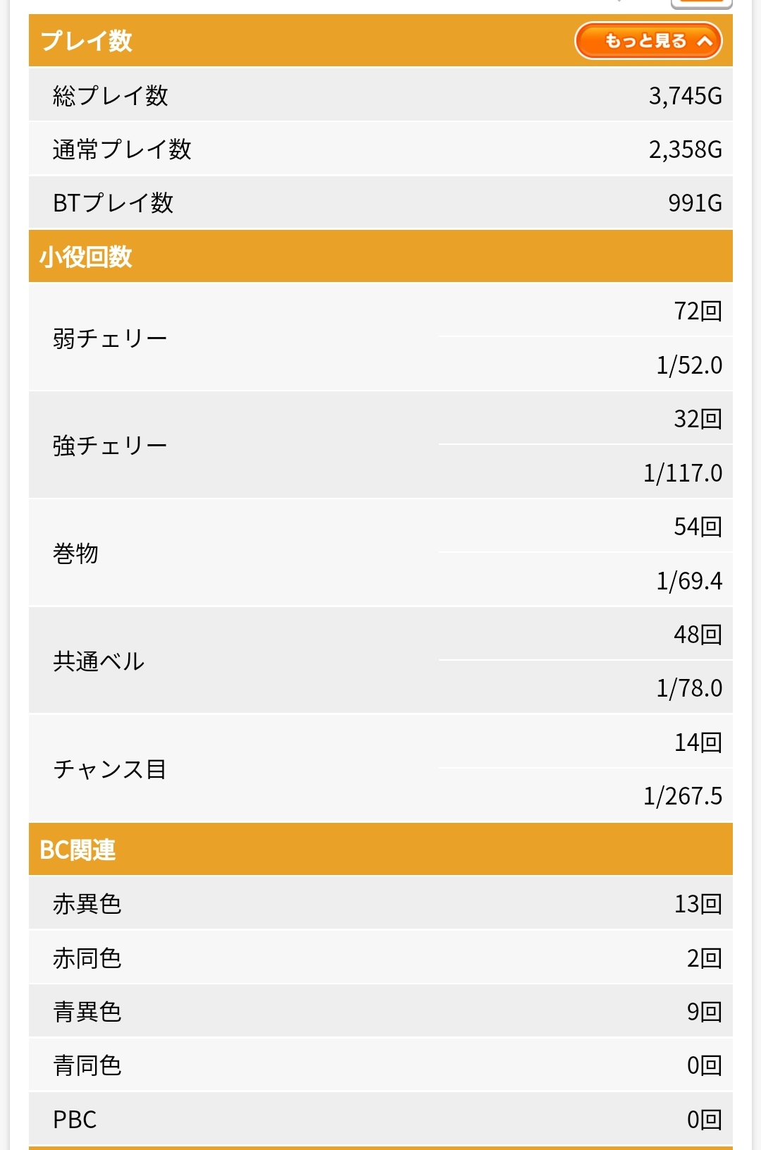ここまでで、テーブル6、テーブル7なので、テーブルだけで見れば、設定6の可能性が高いなという印象です。弱チェリーなどはゴミ数値ですが、も少し続行していきます。